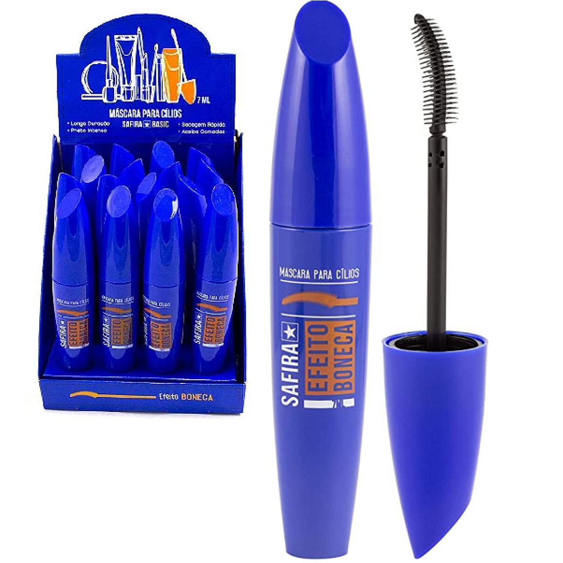 Descrição: Máscara de Cílios Efeito Boneca - Safira, um olhar marcante com cílios super volumosos, essa máscara com textura mais grossinha deixa um efeito impecável desde a primeira aplicação.