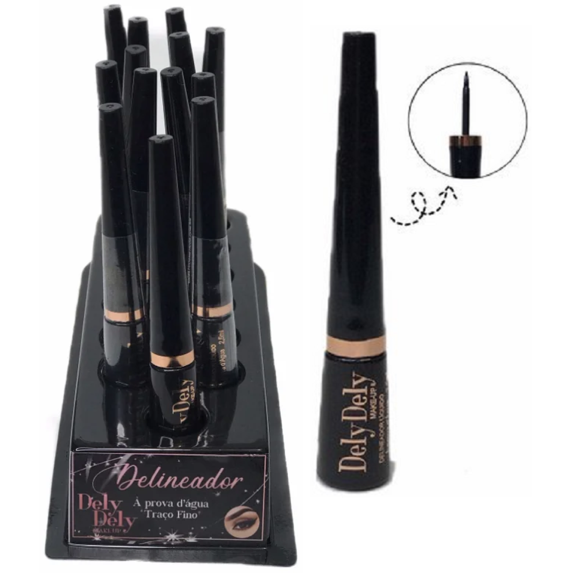 Descrição: O Delineador Líquido Preto da dely dely tem a ponta fininha que é perfeito para criar traços finos e delicados ou grossos, como você preferir! Ele é bem pigmentado.