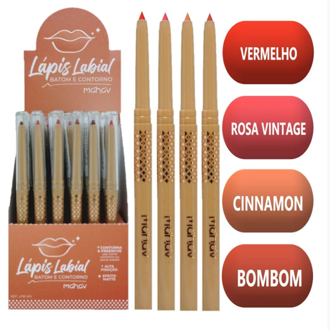 Descrição: Mahav - Lapis Labial Contorno e Batom LPBMV - Kit C/48 und. Mais um sucesso para a Linha de produtos Dia a Dia. Duas cores já são famosinhas: Damasco passou a ser chamado de CINNAMOON e o Rosado passou a ser chamado de ROSA VINTAGE.