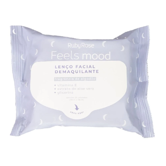 Descrição: Lenço Facial Removedor de Maquiagem da linha Feels Mood com fragrância de algodão. Um novo jeito super prático de remover sua make de uma forma fácil, e em poucos instantes. Você vai amar esse momento único de autocuidado que a Dona Ruby Rose tem com você. Com sua fórmula cheia de ativos MARAVILHOSOS que além de remover sua maquiagem, atua diretamente nas partículas de sujeira deixando sua pele hidratada e rejuvenescida,