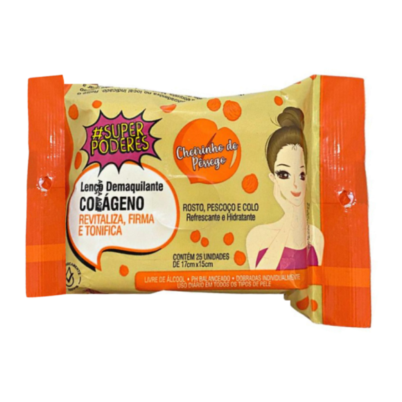 Descrição: O Lenço Demaquilante Colágeno da #SuperPoderes revitaliza, firma e tonifica a pele. Foi desenvolvido para remover a maquiagem e impurezas, deixando a pele limpa, hidratada, refrescante e com cheirinho de pêssego. Indicado para o rosto, pescoço e colo