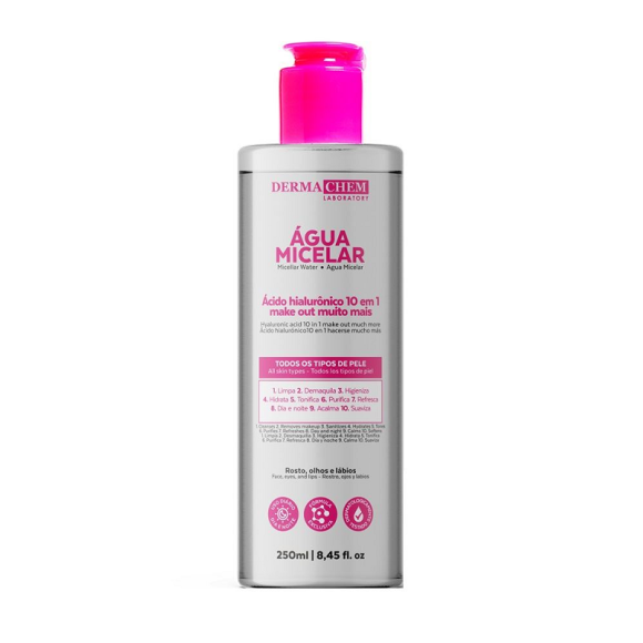Descrição: A Água Micelar da Dermachem tem uma fórmula inovadora,que contém ácido hialurônico. Além de limpar, tonificar e remover maquiagem, proporciona hidratação, uniformidade e propriedades antioxidantes, adaptando-se a todos os tipos de pele, inclusive as mais oleosas.