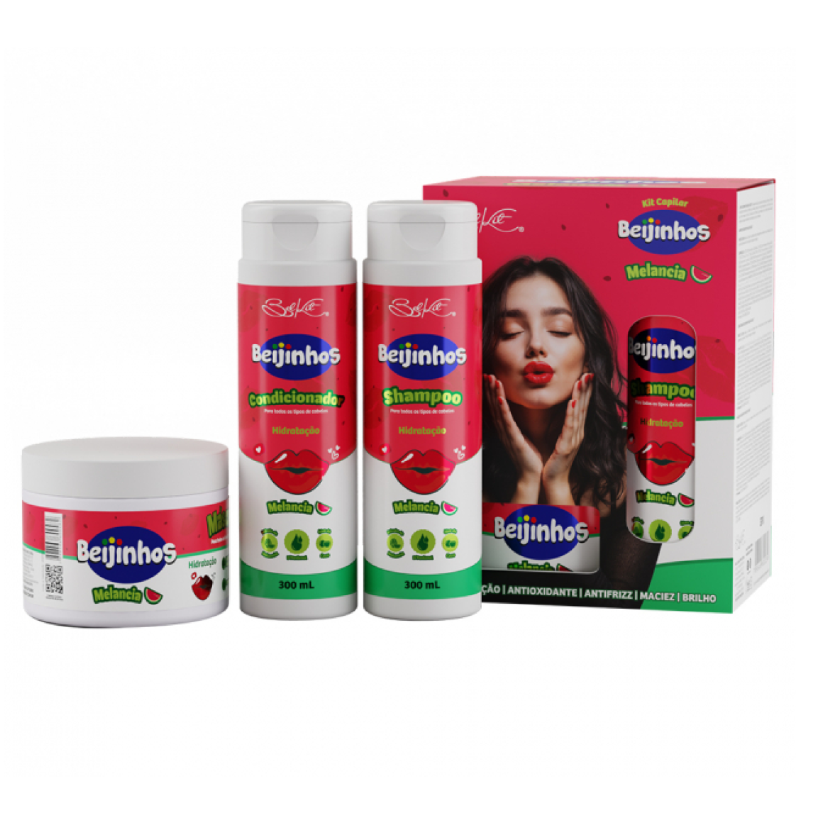 Descrição: A linha de Kit capilar Beijinhos Belkit foi desenvolvida para proporcionar hidratação profunda. A fórmula é enriquecida com Extrato de Melancia, que hidrata, refresca e tem ação antioxidante e com o Óleo de Coco, que nutre e restaura o brilho. Conta ainda com D´Pantenol, que revitaliza os fios, evitando pontas duplas. O resultado: cabelos visivelmente mais hidratados, macios e radiantes.