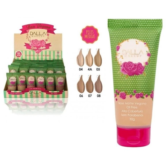 Descrição: A Base Matte Vegana da Dalla foi desenvolvida especialmente para atender a pele das brasileiras, ela contém cobertura excepcional e longa resistência na pele. Com ela você pode construir camadas bem estruturadas, caso queira maior cobertura para a sua pele, mas também pode produzir uma cobertura de efeito mais natural, como você preferir e sem prejudicar seu acabamento final.