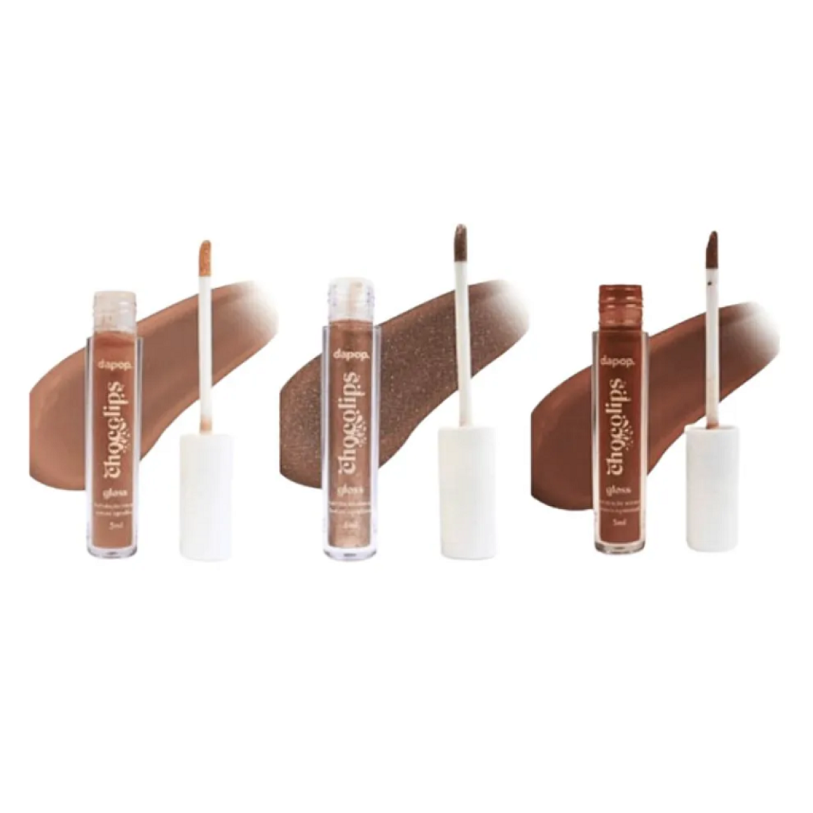Descrição: O Gloss Chocolips Dapop DP2343-A é um gloss labial hidratante com aroma e toque de chocolate, que deixa os lábios com brilho, maciez e hidratação, graças à sua fórmula com manteiga de karité, disponível em diferentes tons de marrom (como translúcido com glitter ou marrom quente) e ideal para usar sozinho ou sobre batom para um efeito mais intenso e sensorial.