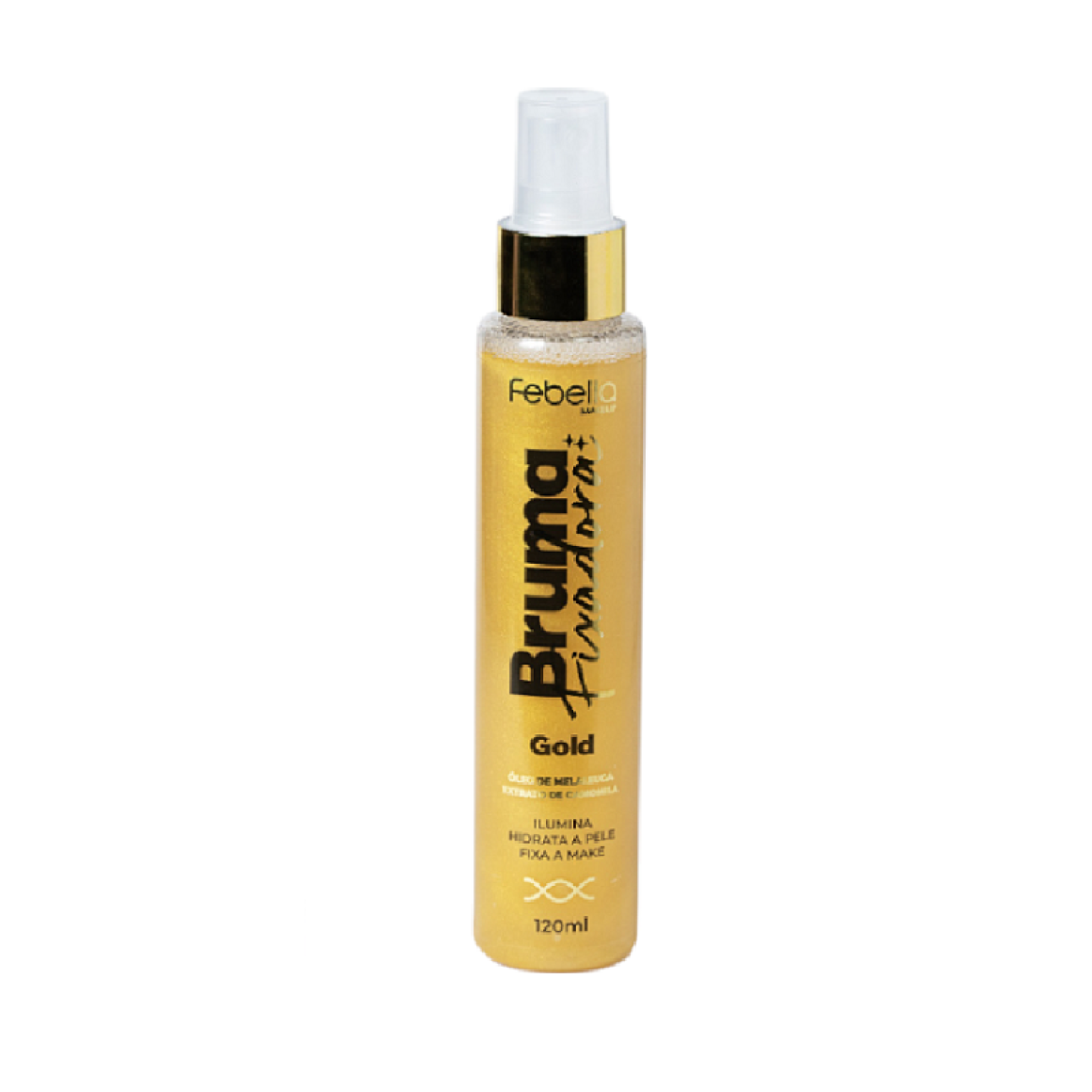 Descrição: A Bruma Fixadora Gold da Febella é um spray finalizador de maquiagem que oferece múltiplos benefícios para a pele e a durabilidade da make.