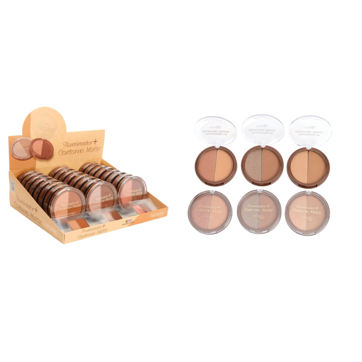 Descrição: O Iluminador com Contorno Matte da Febella é um duo prático 2 em 1 que combina um pó de contorno para definir e esculpir o rosto e um iluminador para realçar os pontos altos, criando dimensão e um acabamento natural com textura aveludada e alta pigmentação.